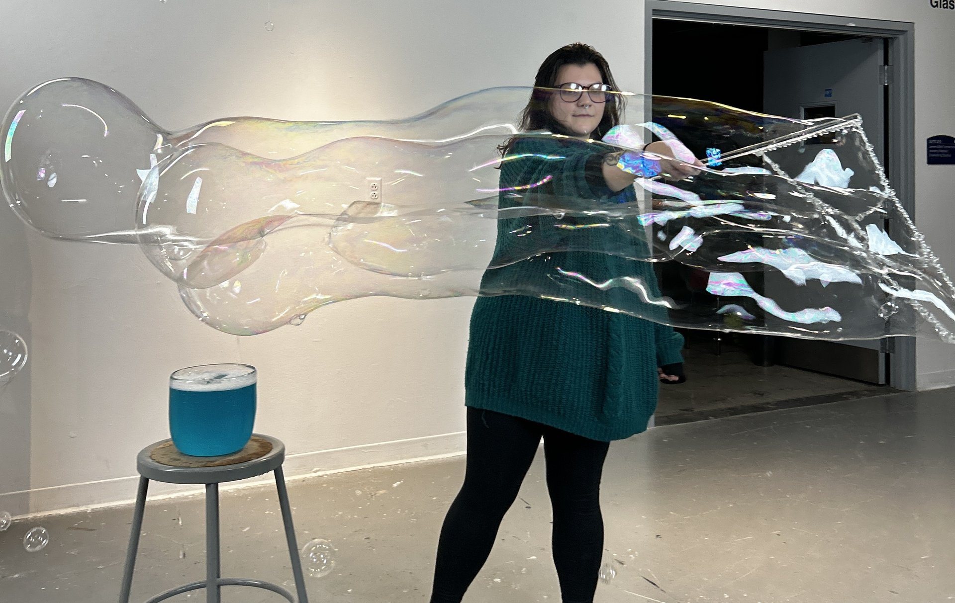 I've been blowing glass since high school and have found peace in it ever since. As a full-time glass blower, a lot of my job is blowing glass bubbles. Sometimes they pop, just like real ones. I don't mind that they're gone. I'm just glad I got to blow them in the first place.